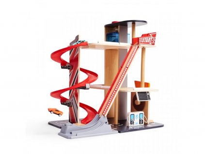 Veľká modrá garáž s výťahom, zaťahovacím dverami, parkovacie závorou, rampami a odrazovým mostíkom.