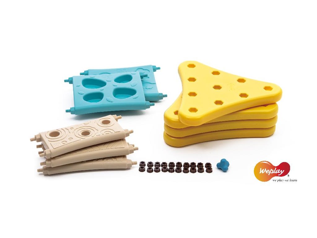 Jednoduché spojenie pomocou trojuholníkov a plastových matíc – deti si môžu vytvárať vlastnú prekážkovú dráhu.